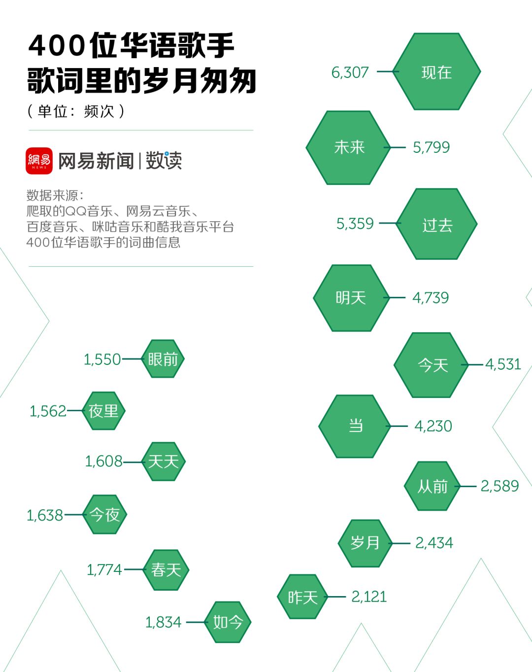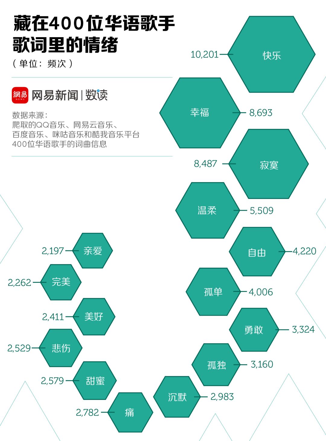 数读菌利用爬虫在QQ音乐、网易云音乐、百度音乐、咪咕音乐和酷我音乐平台上爬取了400位耳熟能详、具有一定知名度、歌曲传唱度较高的华语歌手的词曲信息,并对歌词和能够获得的词曲作者进行词频分析与统计。