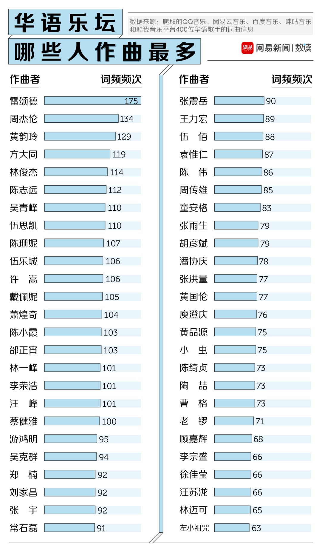 在作曲榜单之上,1969年出生的香港音乐创作人雷颂德以175频次高居榜首,意味着400位流行歌手的可获取的音乐作品中,雷颂德至少参与了175首原创流行歌的作曲。除此之外,黄韵玲、李宗盛、陈小霞等均为年龄在50岁之上的港台地区久负盛名的老一辈曲作家。