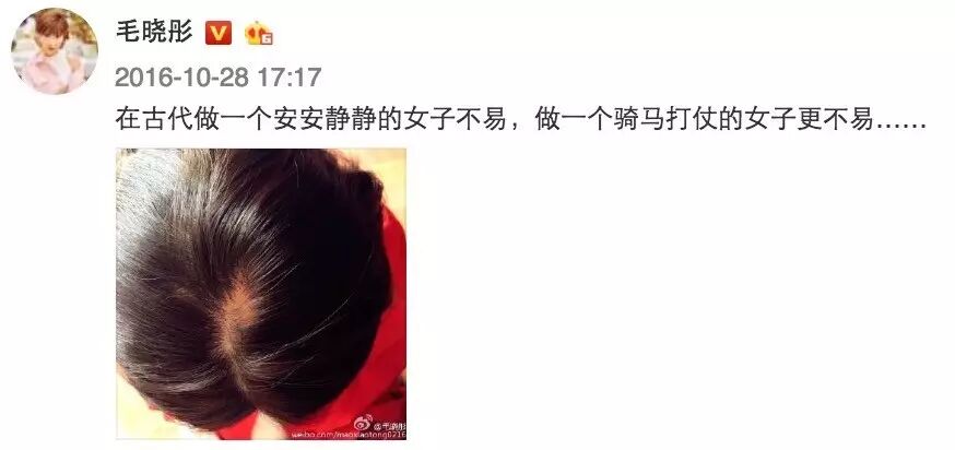 在宁夏拍戏期间,有场戏公主和亲,穿大婚的服饰,头饰太重,连续拍了十天,毛晓彤的头顶被直接拽掉了一撮头发。她在微博上晒出了一张自己头顶秃了一小块的照片,这让不少喜爱她的粉丝心疼不已。医生说头发连根拔起,想恢复需要慢慢调理。到采访当天,毛晓彤的头顶还没全好。