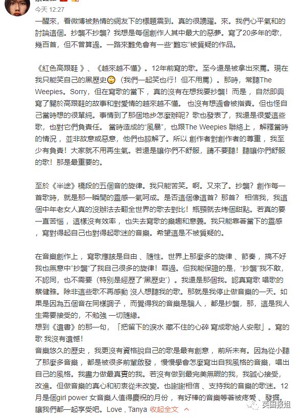 而现在,却有人说这位才女歌手的歌,竟然抄别人的歌,这可以说是非常可怕的指控了。即便上百首歌里只有几首是抄袭,但也是难以抹去的污点,更何况其中还有自己最知名的代表作...