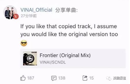 比如之前的有一首歌叫《脑洞大》,就被质疑用了DJ组合Vinai的部分,人家还亲自找了过来,注册了个网易云账号,向他推荐了自己的原版...