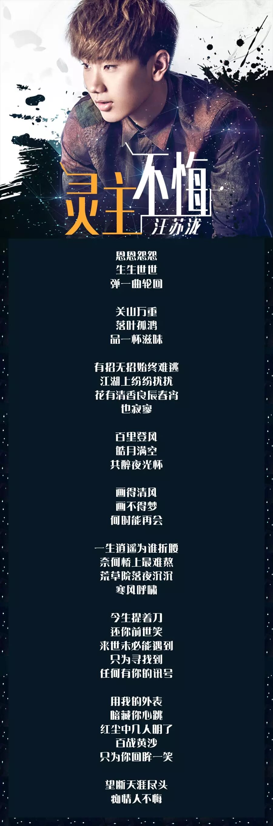 今日,创作歌手汪苏泷的全新单曲《灵主不悔》登陆全网。这是继去年为《花千骨》创作的《年轮》大放异彩后,汪苏泷再度发力,为歌迷们献上的一首全新中国风歌曲。
