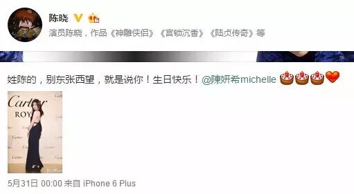 ▲陈晓于5月31日公开祝陈妍希生日快乐
