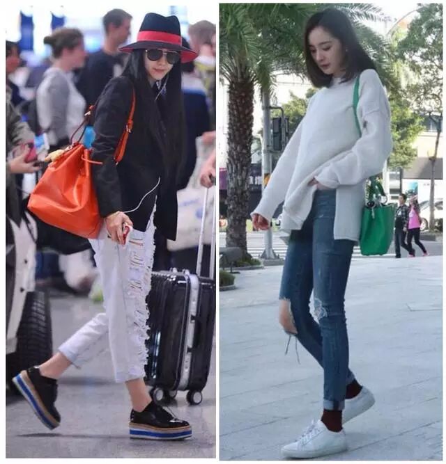 范爷穿牛仔裤搭这双黑色厚底鞋,真没觉得好看,杨幂穿破洞牛仔裤搭小白鞋,百搭时尚又舒适。
