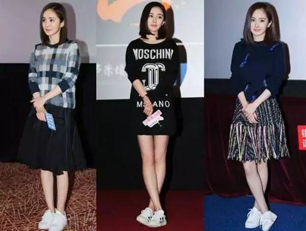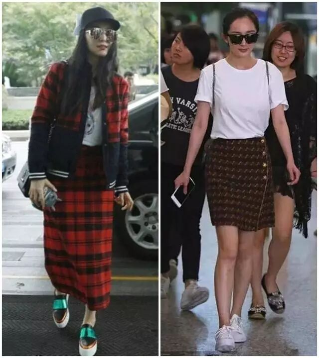 范爷穿格子裙搭厚底鞋,感觉很厚重,臃肿的很,杨幂看起来则清爽一些,穿白T搭半身短裙,一双小白鞋,时髦极了。