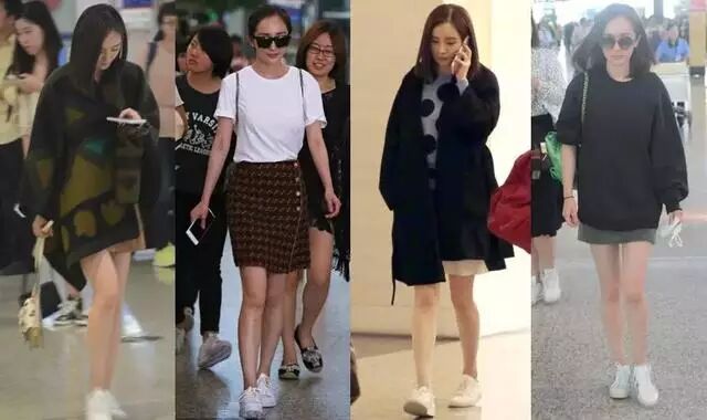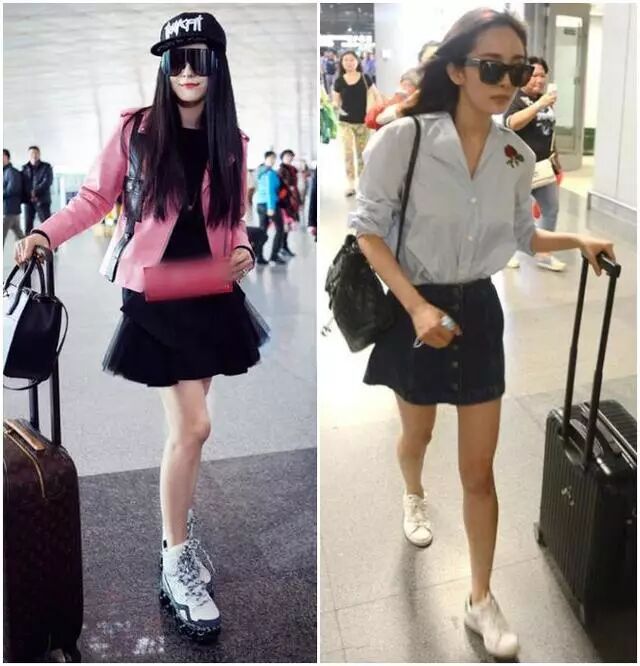 机场街拍,范爷穿粉色小皮衣搭黑色小短裙,搭的还是这双厚底鞋,杨幂穿衬衫搭牛仔裙,脚踩小白鞋,更加清爽时髦哦。