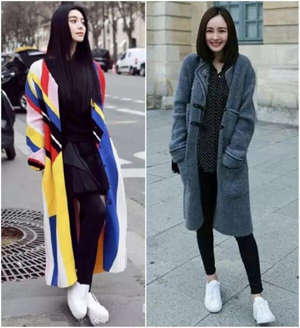 同样穿长开衫,范爷搭的是白色厚底鞋,杨幂穿平底小白鞋,更加清爽百搭,没有厚底鞋的厚重哦。