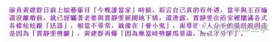 贾静雯与黄建群12年前因为合作《法医奇案》传出绯闻,导致黄建群与王百瑜以离婚收场,当年2人否认绯闻,但时过境迁,黄建群松口坦承曾背着老婆与贾静雯交往,王百瑜也在多年后,爆料曾在临盆前抓到贾静雯下黄建群的车、前后进出饭店的交往证据,隔天即在气愤中生产。