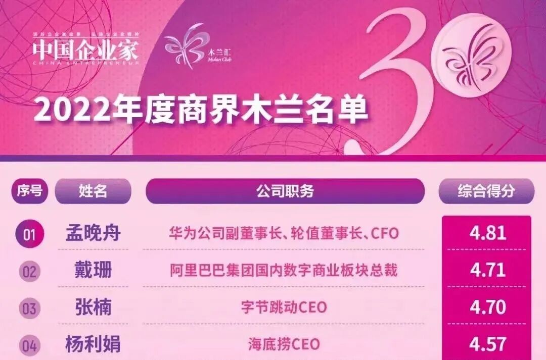 第一代任总做的事情是创业,第二代孟晚舟正在做的事情是守业,最近刚刚入选2022年度“商界木兰”名单。