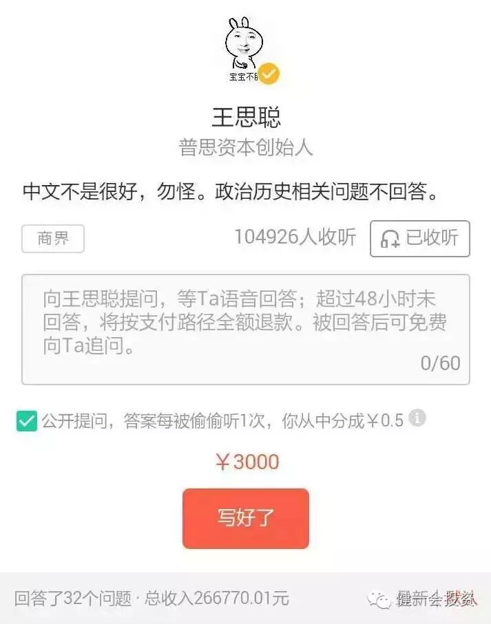 当代网红王思聪童鞋在某款平台上与众粉们分享了下自己最喜欢的啪啪啪姿势,按偷听一条一块钱算,两万多块银子落入囊中。截至今日,他回答了32个问题,赚了26万块钱。