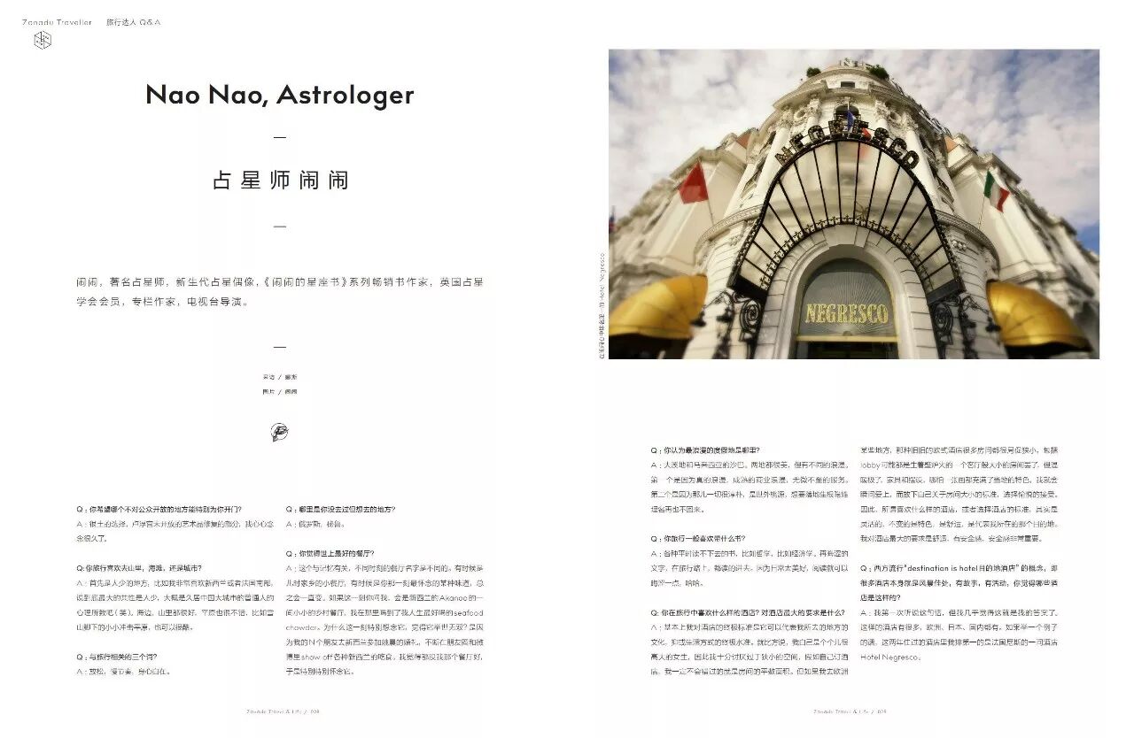 闹闹,著名占星师,新生代占星偶像,《闹闹的星座书》系列畅销书作家,英国占星学会会员,专栏作家,电视台导演。她在采访中的回答更像是一篇攻略,比如她说自己非常喜欢新西兰和法国南部,最想去的地方是俄罗斯,秘鲁。这两年住过的酒店里在她心中排第一的是法国尼斯的一间酒店Hotel Negresco。这些推荐都十分适合纳入你的旅行清单。