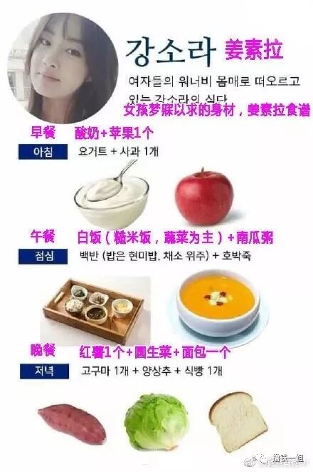 这里奉上她的食谱,吃得很多但都是低热量的健康食物,所以减脂真的不是靠少吃或者不吃来让身体被迫代谢肌肉、水等等,而是靠少食多餐加上运动来主动提高代谢。