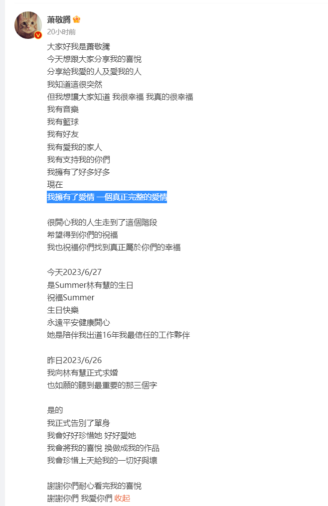 36岁萧敬腾,为何爱上50岁姐姐? 苏心 港台男星 2023-10-21 07:08:10 299 创作不易,用心坚持,欢迎请BaGua喝几杯爱心咖啡!打赏并支持本文 打赏并删除本文 作者:十二来源:不畏将来不念过去(ID:shier1213)10月19日,歌手萧敬腾在网上晒出和林有慧的婚纱照,并写道:“这一天是如此美好”。自从恋情曝光,人们很关注他俩的年龄:萧敬腾36岁,经纪人林有慧已经50岁了,男方比女方小了14岁;而周杰伦和昆凌两人也相差14岁,只不过是女方小了男方14岁。但当年没人热议周杰伦与昆凌的年龄差,而这一次,大家都在问,林有慧到底是何方神圣?为什么萧敬腾面对她,求婚时求到泪流满面?搞清楚了这个问题之后,我才知道,原来她才是那个帮萧敬腾逆天改命的女人。01萧敬腾出道前,曾是社会上的问题青年,坏事做尽,抽烟喝酒、殴打他人,以致进少管所。刚出道那会,他木讷羞怯,在媒体面前无法大大方方地展示。而林有慧毕业于纽约理工学院,并获得了传播学硕士学位,她家境也不错,爸爸是台湾谐星林光宁,在娱乐圈中有不少人脉。当时的林有慧已从艺人助理做到了独立开经纪公司的地步,带红了F4、张惠妹等明星。萧敬腾那时刚出道,什么都不懂,也不知道该选择签给谁,于是向王牌经纪人林有慧发出了“求助”信号,林有慧看他又瘦又小,同情心泛滥,还张罗着给他找房子。在相处中,林有慧看到了他的音乐才华,一步步引导他如何在舞台上绽放自己的光芒。林有慧既是萧敬腾的经纪人,到处为他找资源,同时又主动做起了生活助理的工作,帮他穿好外衣、化妆、带他去看医生,叮嘱他吃药,甚至背熟了萧敬腾的病历本。两人的相处时间之长,连萧敬腾家里的狗狗都对林有慧亲密无间,若狗狗同时看到萧敬腾和林有慧,都是第一时间黏向林有慧。成名后,萧敬腾买下了一栋八层楼的大豪宅,定制了一批高级的乐器,家中还有一层,专门用来收藏大型手办,家里的地下车库,摆放着萧敬腾的不少豪车。家里的很多东西,都是林有慧一手操办的。不仅如此,林有慧还帮助萧敬腾投资理财,在房地产上出手快狠准,让萧敬腾的资产越来越多,以至于萧敬腾特别信赖林有慧。不管是看房还是买房、装修等,都是林有慧独当一面。萧敬腾曾花1000万人民币买下两套房子,树大招风,引起湾湾税务的极大关注,被质疑逃税漏税。林有慧出面解决了这件事,最后让萧敬腾转危为安。不仅如此,她简直就是萧敬腾的超级保护伞。萧敬腾曾遇到私生饭的骚扰,名气扫地。私生饭是一个富婆,动用黑道的人脉,逼迫萧敬腾见自己一面,否则就威胁恐吓,甚至半夜按下萧敬腾家门铃,雇人拦截萧敬腾的车,遭拒后泼粪便泄恨。富婆一方面造谣和萧敬腾有过一夜情,另一方面又寄活虫冥纸信件恐吓萧敬腾,想要试图换来萧敬腾的妥协。刚硬的林有慧,坚持求助警方,每天奔波于家里和警局之间,为萧敬腾讨回了公道,获得了80万新台币赔偿。这样的陪伴和付出,别说是萧敬腾了,连我都直叹,这命太好了吧!这简直就可以脑补一出宿世纠缠的纯爱小说。什么都不必解释了,这就是命定的缘分啊。从现场求婚视频看,萧敬腾在表白时连连哽咽,眼眶通红。而且,他还大胆承认了“我们偷偷相爱了16年”。那也就是说,从20岁开始,萧敬腾已经爱上了34岁的林有慧。但那个时候,恐怕不只是年龄差,还有彼此身份地位的悬殊,以及舆论的巨大压力。要知道,当年王菲跟谢霆锋牵手门,相差11岁,那已经是媒体的地震,轩然大波。02当年,萧敬腾唯唯诺诺,年轻瘦小,根基不稳,在娱乐圈是小透明。如今,萧敬腾走到哪里,镜头就跟到哪里,是台娱养家糊口的依靠之一,这段时间,湾湾被负面新闻缠绕,这回终于来了一个正面新闻,可以暂时压倒负面新闻,台娱自然求之不得。而萧敬腾和经纪人过往的蛛丝马迹,更是被扒得一清二楚。萧敬腾参加综艺节目《花花万物》时,被主持人问到:“你的女朋友是你经纪人嘛?”萧敬腾没有否认,只是回应道:“我希望这件事情是有一天我自己主动想要讲出来。”但后来萧敬腾又否认了,推说是节目组剪辑的原因。林有慧随即也否认,但话说得含糊不清,她承认自己和萧敬腾的关系超过一般的经纪人与明星。萧敬腾参加《我是歌手》时,在台上深情款款地唱起了《你是我心爱的姑娘》,而台下的林有慧如同歌曲里的女主角,眼里嘴角是藏不住的幸福。演唱完毕,情绪十分激动的萧敬腾,还拥抱了一下林有慧,两人亲密得好像还亲吻了一下。两人也经常被拍到,一起出去旅游,一起出去吃饭,还互相夹菜……但因为是经纪人的关系,陪伴左右,本身也是很正常的事。事业处于上升的空间,无法明目张胆地公开,因为一旦谈恋爱,可能会面临“掉粉”的打击,而流量对于明星来说就是一切。虽然没有当众承认过,但圈内人应该都知晓且默认了这份关系。可是这么多年,却没有一个圈内人或者狗仔出来曝光这件事,足可见林有慧的人脉及手段。我想,这一切操作都是因为林有慧足够成熟,也足够隐忍,她相信自己一定会等到,可以光明正大的那一天。如今,萧敬腾正如他自己所说:“拥有了一个真正完整的爱情”,也算是得偿所愿了。03近水楼台先得月,很多明星最后都是选了经纪人、助理。比如,胡歌突然官宣生女,对象是陪伴自己多年的助理。古巨基也找了自己身边的贴身助手,今年3月份,古巨基就在社交平台上官宣自己喜当爸爸了,幸福之情溢于言表。古巨基的老婆陈韵