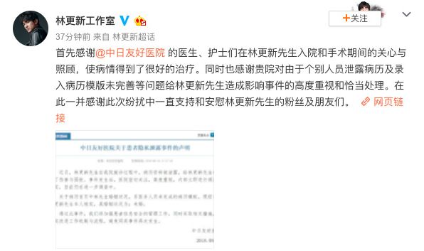 此前,林更新工作室发文谴责医院曝光林更新看病信息,并把婚姻状况一栏写成“已婚”。近日,医院发文致歉表示病历首页上的婚姻状况问题系医务人员未完成的病历模板,经与林更新本人核实其婚姻状况为未婚,目前内部仍在进一步调查中,未来将加强患者信息的安全管理。