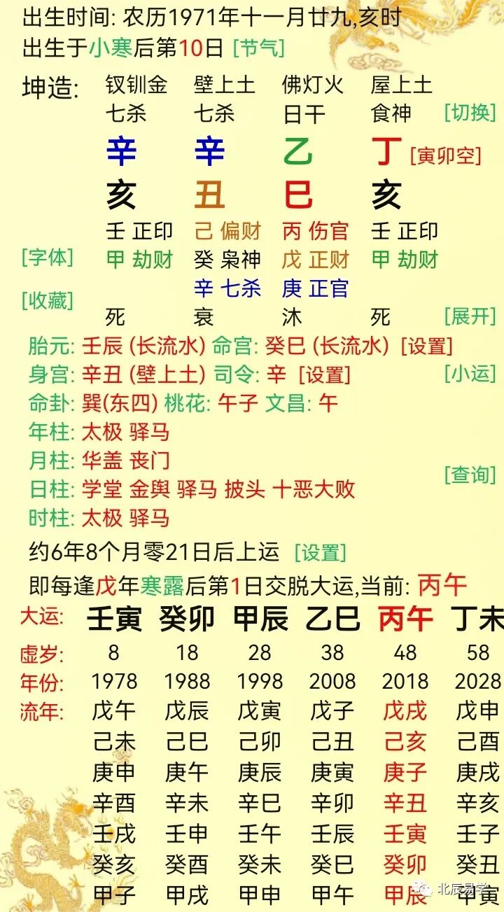 八字伤官生财,命主本人是明星。根据网上的公开资料,陶虹成名是在2000年左右,在甲辰大运。此运辰土为用,确属好运,与命主经历是吻合的。命主真正大红大紫是在乙巳运,巳火伤官发挥了作用,因此命主在演艺事业方面顺风顺水。