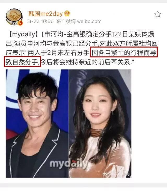分手那会儿刚好《鬼怪》火到不行,很多人都说是金高银和孔刘在一起了所以和申河均分手。