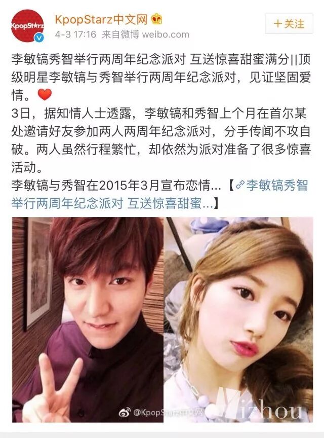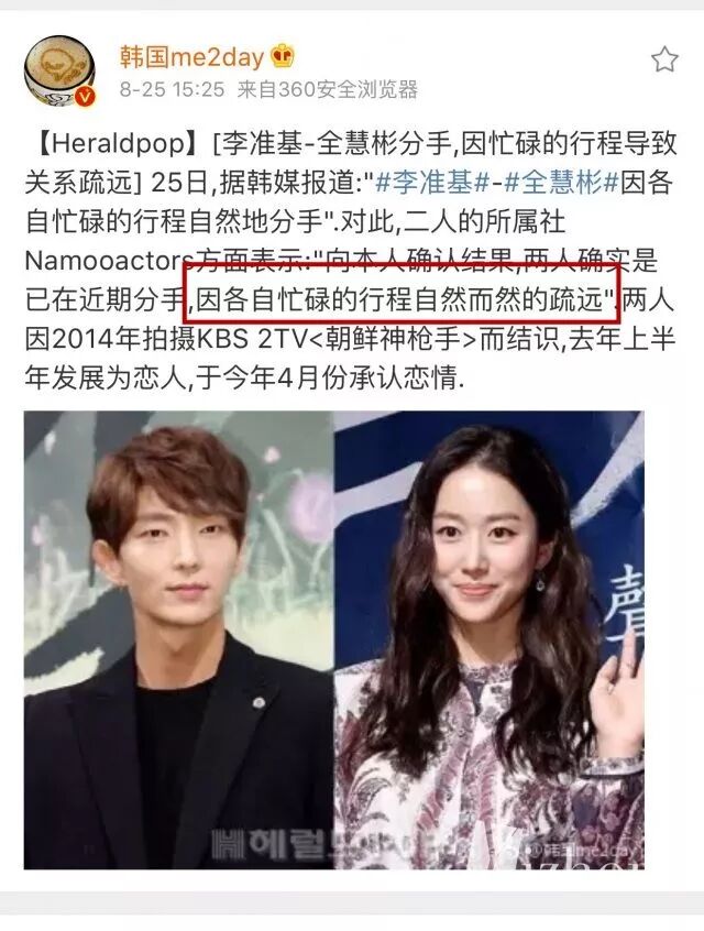 昨天韩媒曝出李敏镐和秀智在近日已经分手。
