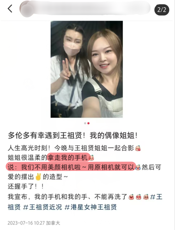 另外一位偶遇王祖贤的粉丝就比较幸运了,王祖贤答应了她合影的要求。合影的时候,王祖贤很温柔拿走她的手机说:我们不用美颜相机啦~用原相机就可以。然后还很可爱地摆了个“v”的造型。