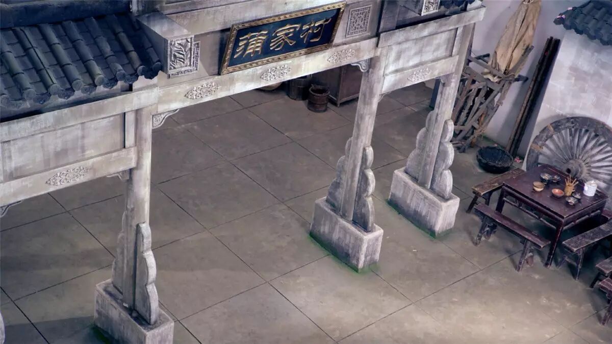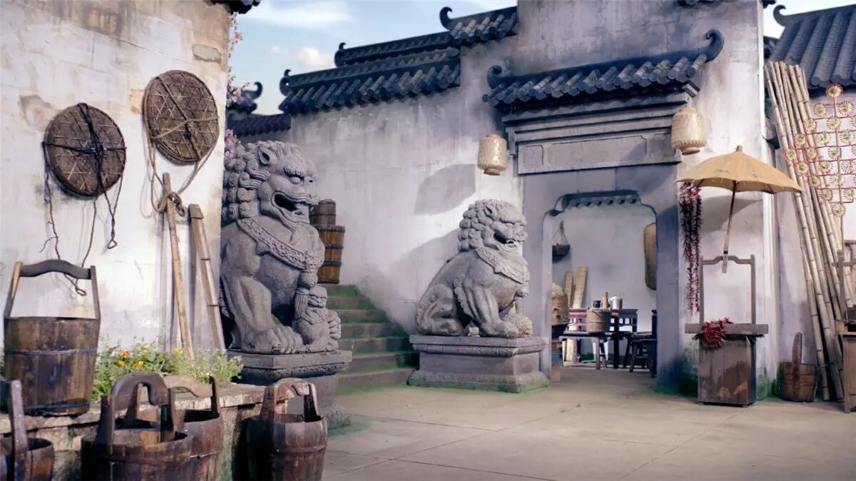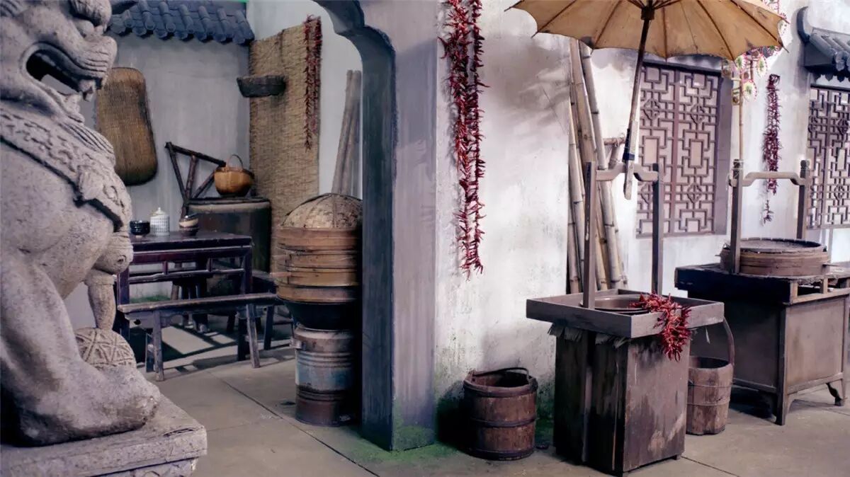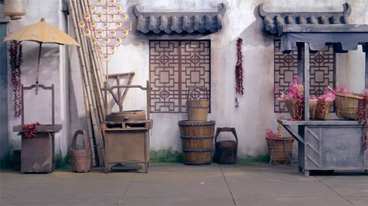 实景搭建的徽派建筑一经做旧,立马秀古色古香起来。脚下的青苔,和水面上撒的水,让整个场景也更加清新。即使是那些摆设的水桶,小车,也是实实在在的东西。对场景细节的把控,简直到了令人发指的程度,估计导演应该和杨总一样,是个处女座吧?