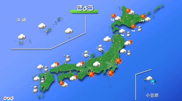 接下来是各地今日的天气情况。冲绳多云,部分地区入夜有降雨。九州南部、四国、山阳、近幾地区云团广布,局部地区将有雨雪天气;预计部分地区也会出现积雪。九州北部、山阴地区到北陆、东北以及北海道地区的日本海沿岸将出现间断性降雪。此外预计局部地区还将出现伴有雷或暴风雪天气。(大家)务必小心注意大雪天气。因积雪在短时间内激增,请小心雪崩和屋顶上的落雪。东海和关东地区基本上天晴。东北和北海道地区的太平洋沿岸乌云广布,部分地区有雪云涌入。