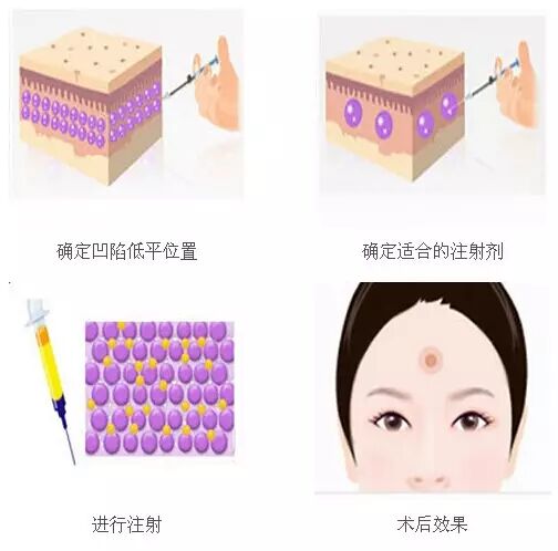 将玻尿酸/自体脂肪作为组织填充剂。注射使用的玻尿酸是经过纯化的成分,注入后会与人体融合,皮肤会膨涨、皱纹变平隆起,达到丰额的目的。