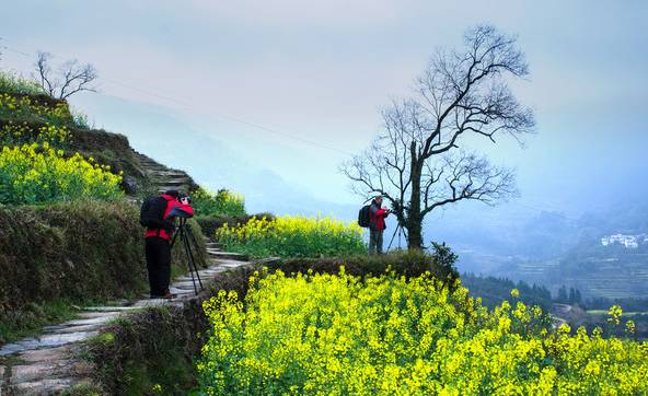 走进婺源,置身于梯田间,黄灿灿的油菜花与远山、近水、粉墙、黛瓦相印成趣,构成一副天人合一的画卷。在这里您可以感受到天人合一的境界,让心灵自由飞翔,尽情释放,五种颜色,和谐搭配,胜过世上一切的图画,难怪这里是摄影家的拍摄的天堂。