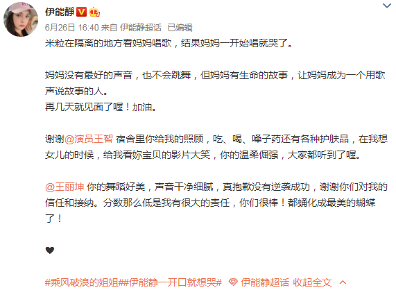 浪姐一公结束后的个人采访,轮到了在《推开世界的门》组担任队长和C位的伊能静。