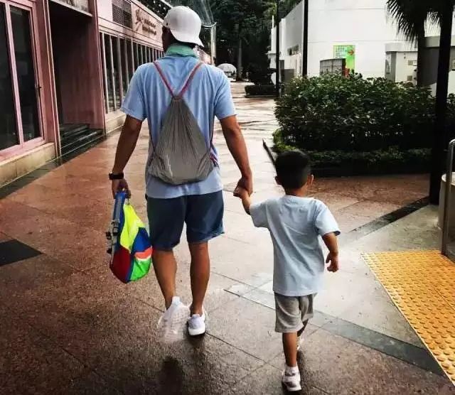 一身休闲装扮的陈小春左手拿着儿子的书包,右手牵着儿子Jasper,父子俩走路的姿势简直一模一样。