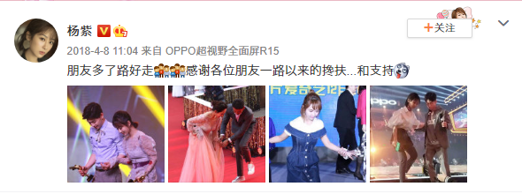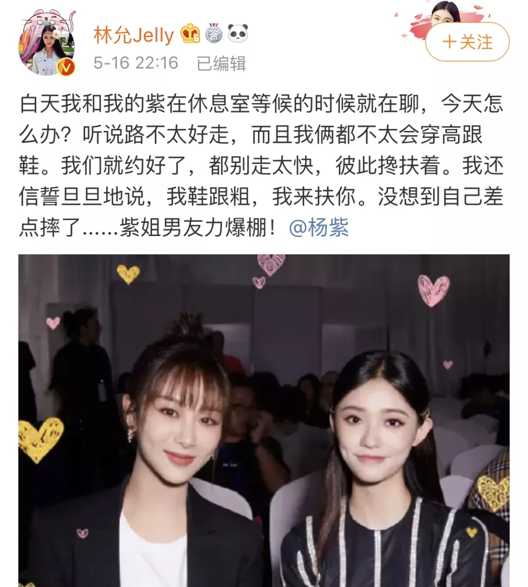 对此,林允还特意在微博上表示了对杨紫的感谢,称她男友力爆棚。