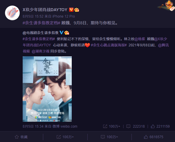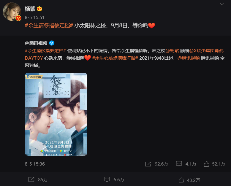 杨紫和肖战主演的电视剧《余生请多指教》定档了,9月8日即将播出。