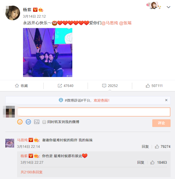马思纯曾在微博上说,在她最难的时候,是杨紫给了她很多的陪伴和鼓励。
