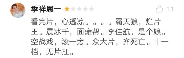 最后这位网友诗写的不错,只是“十一档,无片扛”说的有些早吧,接着就有龙叔的《英伦对决》、开心麻花的《羞羞的铁拳》和甄子丹刘德华的《追龙》上映了!