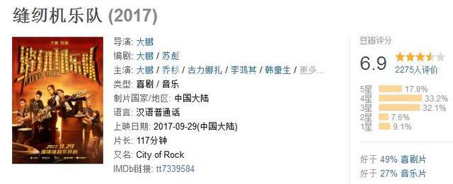 目前,《 缝纫机乐队》的豆瓣评分已经出来了,6.9分,相比大鹏第一部自导自演电影《煎饼侠》的6.0分,已经进步很多。
