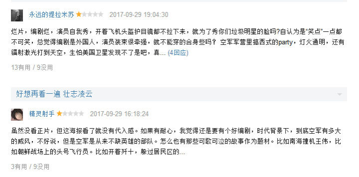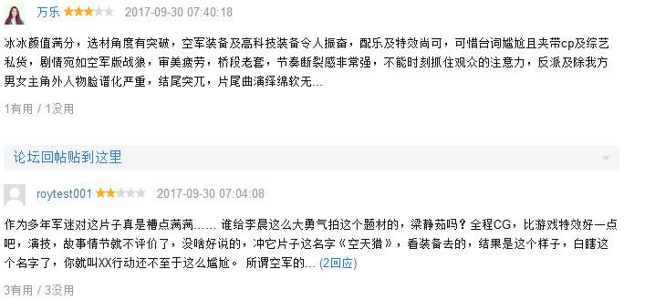 而在豆瓣,《空天猎》的口碑也是不尽人意,很多观看后的观众都对《空天猎 》表示失望,可能是《战狼2》带给了大家太多的惊喜,《空天猎》则是对比出了更多的无奈。