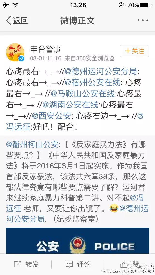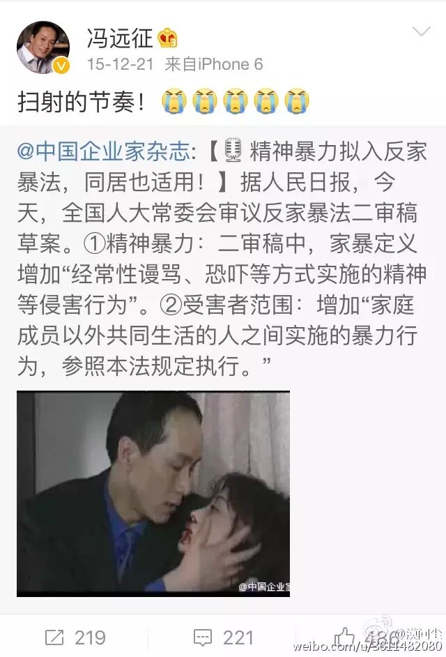 前日,“太子妃”张天爱转发联合国官方一条反家暴的微博,并写道: “要保护好老婆”。