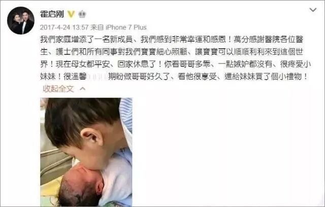 2017年4月24日,郭晶晶诞下第二胎女儿,霍启刚微博报喜。