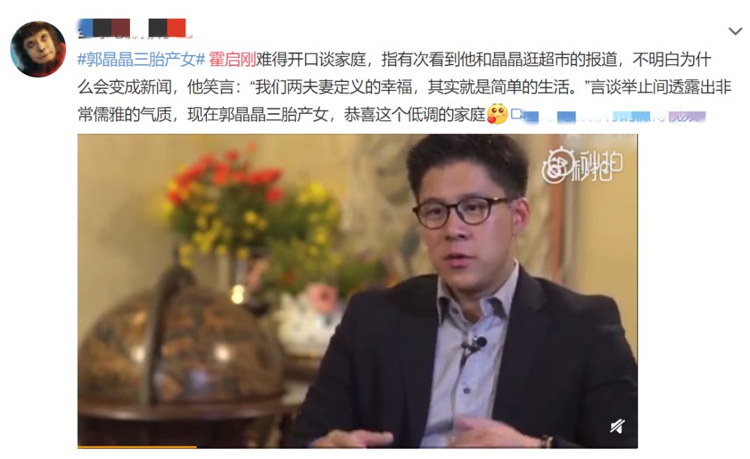 想要了解他俩的日常生活,一般都是要翻翻霍启刚的个人官方微博或者香港报章杂志。最近郭晶晶霍启刚一家的情况,还是霍启刚主动在微博上晒出的。