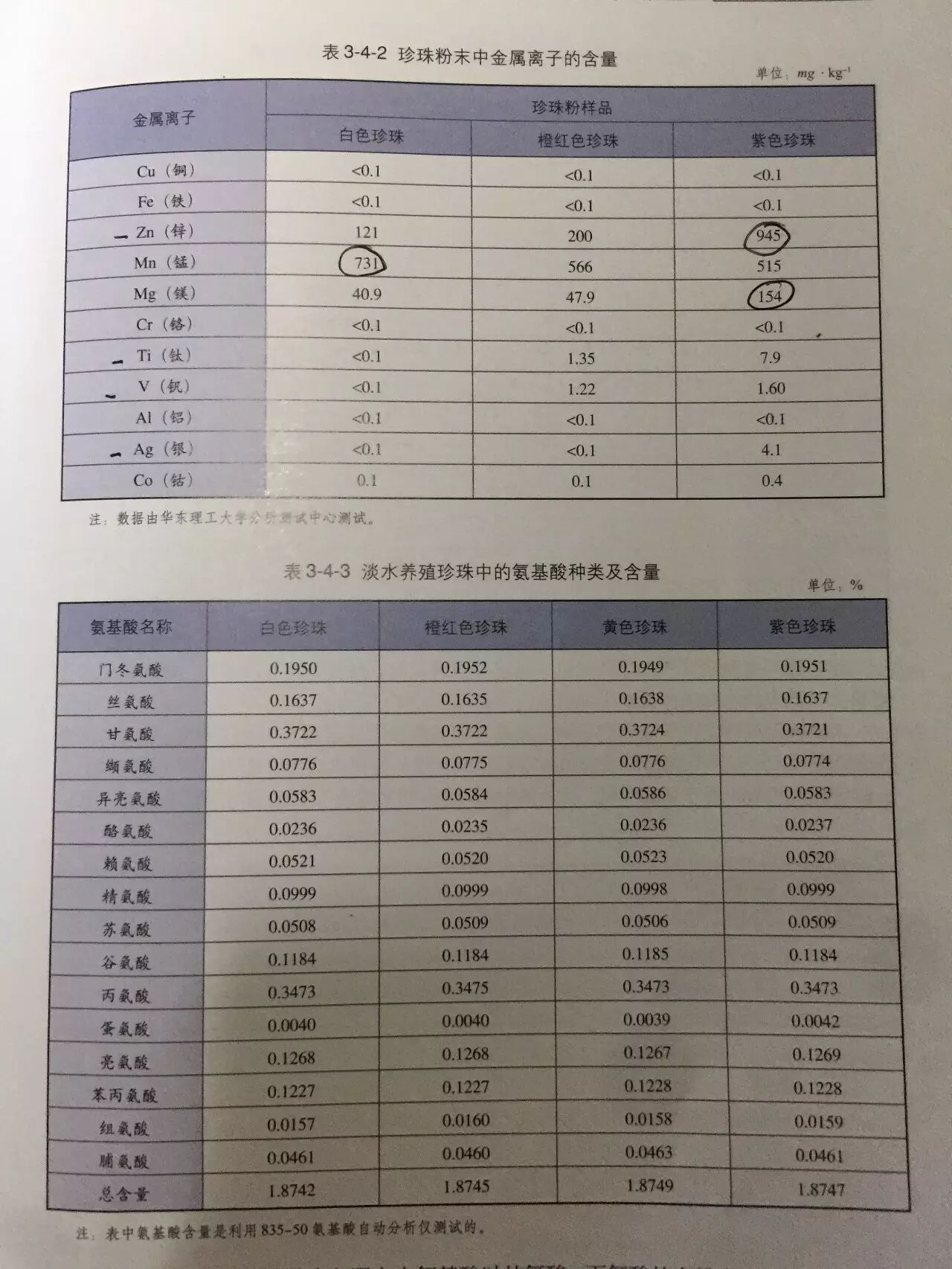 在图中可以看到不同颜色的珍珠里面所含的金属离子比例是不一样的,比如白色珍珠体内所含的锰离子比其他两种含量偏高些。紫色的镁离子和锌离子比其他两种含量多一些,橙红色的珍珠是介于白色和紫色之间。所以,珍珠体内所含的各色致色离子,金属离子和有机色素的含量不一样就会影响珍珠的颜色。