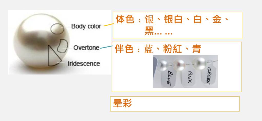 所以珍珠的颜色就是由这三个部分组成的,体色,伴色和晕彩,但是不是所有的珍珠都有这三个颜色?有的珍珠是没有晕彩的,有的珍珠是没有伴色,所以这三种不是一定会同时出现在每一种珍珠上面。