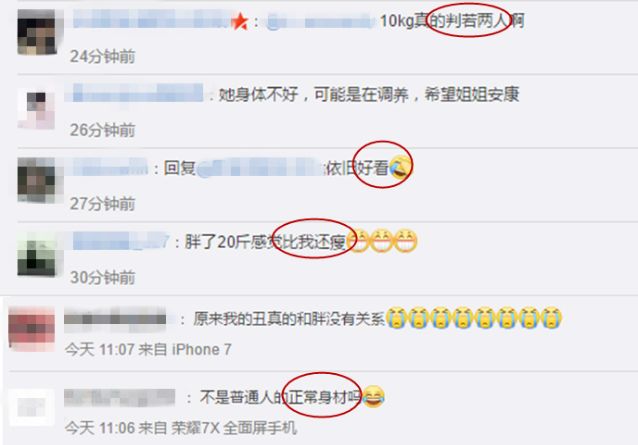 而粉丝的关注点是:胖十公斤很明显?胖了也依旧好看;十公斤根本不叫胖,顶多是普通人的正常身材,态度各异。