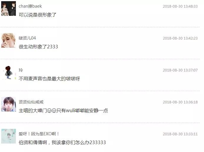 看着音量差异巨大的EXO的团员,粉丝们纷纷留言道:“可以说是很形象了”、“很生动形象了2333”、“不用麦声音也是最大的波波呀”、“主场的大嗓门,只有wuli嘟嘟能安静一点”、“伯贤和倩倩啊,我该拿比你们怎么办233333”。