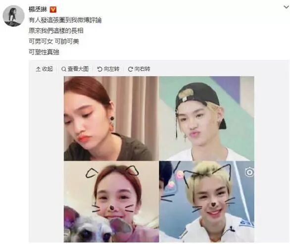 早前在《偶像练习生》中,很多网友就发现Justin黄明昊各种表情和节目中导师李荣浩女友杨丞琳好像。杨丞琳也曾在微博晒出自己和黄明昊的对比照,称“原来我们这样的长相,可男可女,可帅可美,可塑性真强!”