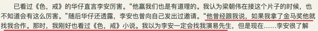 刘德华有次透露,李安曾经向他抛出橄榄枝,说如果刘德华拿了金马奖就跟他合作。