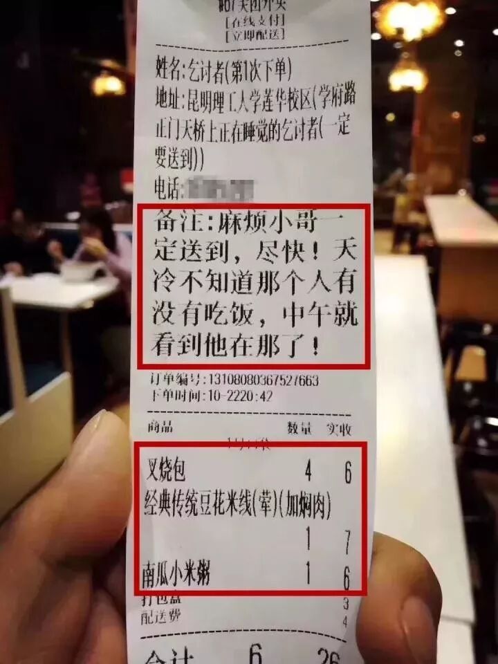 留言上写着:“昆明理工大学莲华校区学府路学校正门天桥上,有个正在睡觉的乞讨者,麻烦小哥一定送到,尽快!天冷!不知道那个人有没有吃饭,中午就看到他在那儿了。一定要送到!”