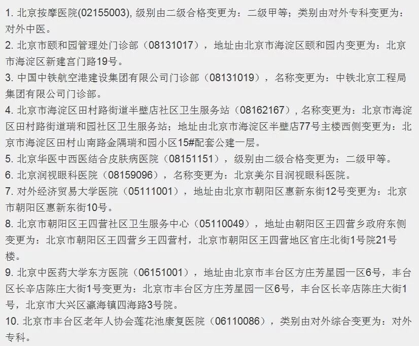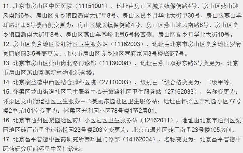 医保定点的选择,关乎老百姓的看病大事。10月25日,北京的医保定点机构又有17家有所变更, 此次调整,只是部分医院级别、类别或地址的变更,并未涉及到取消医院医保定点资格。这17家医保定点究竟变在哪儿,参照下列表格内容: