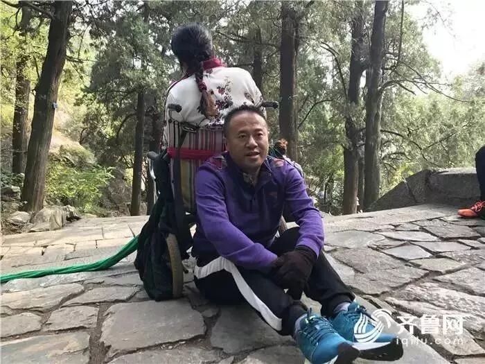 近日,张玉华用红绳将妻子固定在轮椅上,背上轮椅,一步一步爬台阶,8个小时后,终于到达南天门…张玉华说,等待这一刻他准备了17年,妻子非常激动,这次旅程将是见证他们的勇气与爱情之旅。