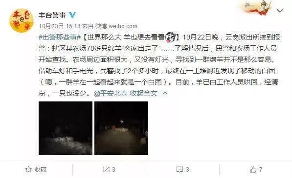 10月22日晚,云岗派出所接到报警:辖区某农场70多只绵羊“离家出走了”……了解情况后,民警和农场工作人员开始查找。农场周边面积很大,又没有灯光,寻找到一群绵羊并不是那么容易。