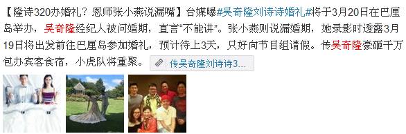 吴奇隆刘诗诗婚礼定在3月20日,如果汪峰章子怡补办婚礼属实,那3月份就热闹了!吴奇隆这边嘉宾据说还有这一对,你们干脆一起办了好不好?