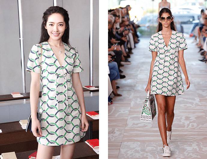 像青春无敌,身穿 Tory Burch 2017 春夏系列 V 领收腰印花连衣裙,绿色荷叶边运动鞋,手拿格纹编制单肩包的郭碧婷。