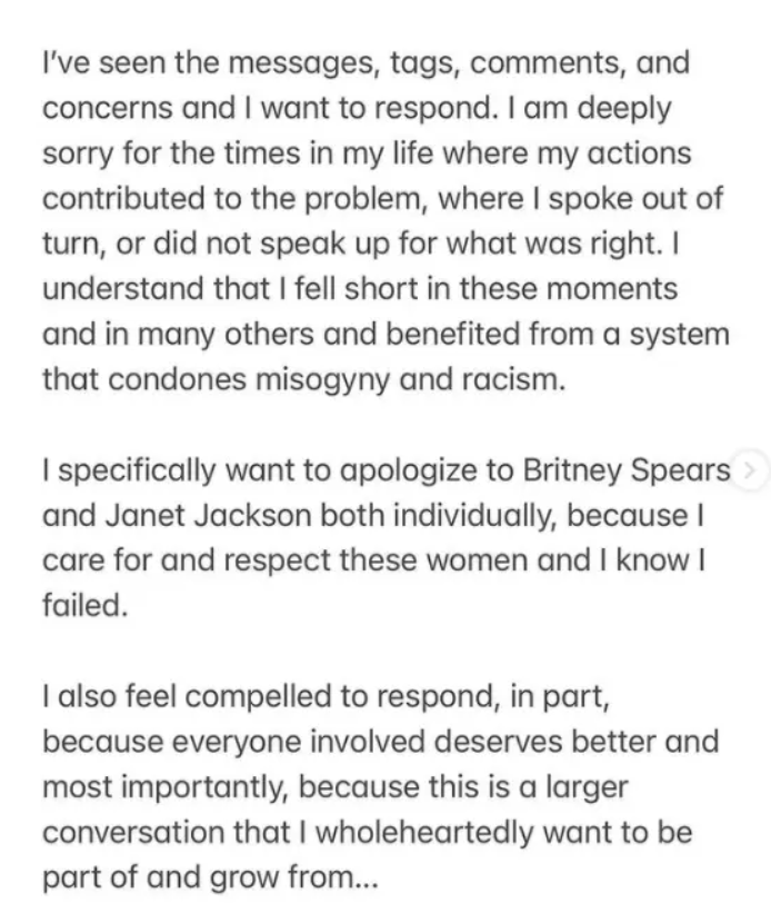 直到 2021 年 2 月,Justin Timberlake 才在 IG 上发文向布兰妮道歉,